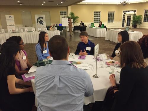 The Capital Area Health Alliance’s 8th Annual Medical Student Networking and Dine Around Evening, held on November 3, 2016, was a successful event, thanks to the hard work of the Capital Area Physician Experience (CAPE) committee members, the generous support of 15 sponsors, and the participation of 25 physician mentors and resource people. An engaged group of 63 students from the MSU College of Human Medicine and MSU College of Osteopathic Medicine attended to participate in roundtable discussions with Lansing area physicians of different specialties and experts on Graduate Medical Education and state loan repayment programs.