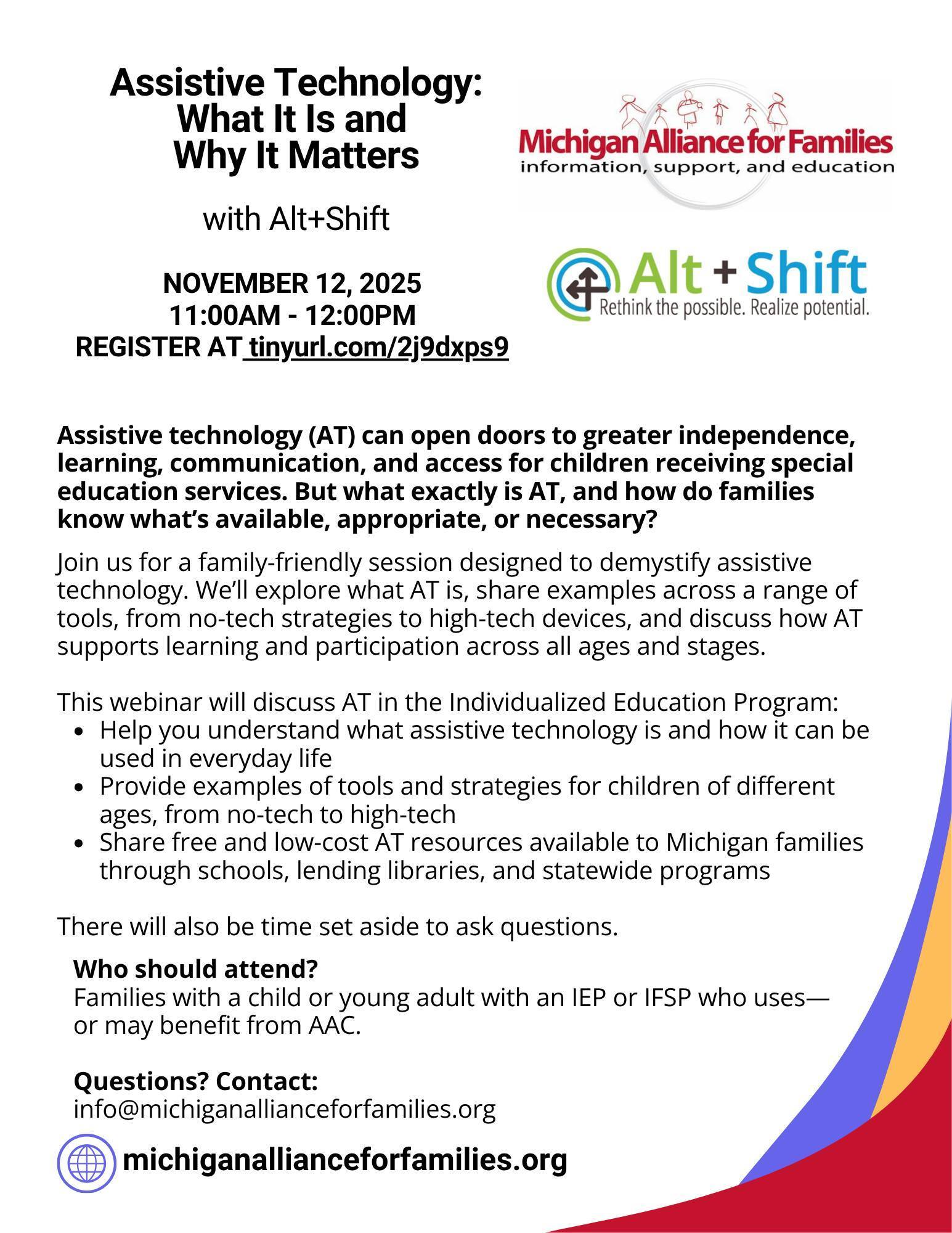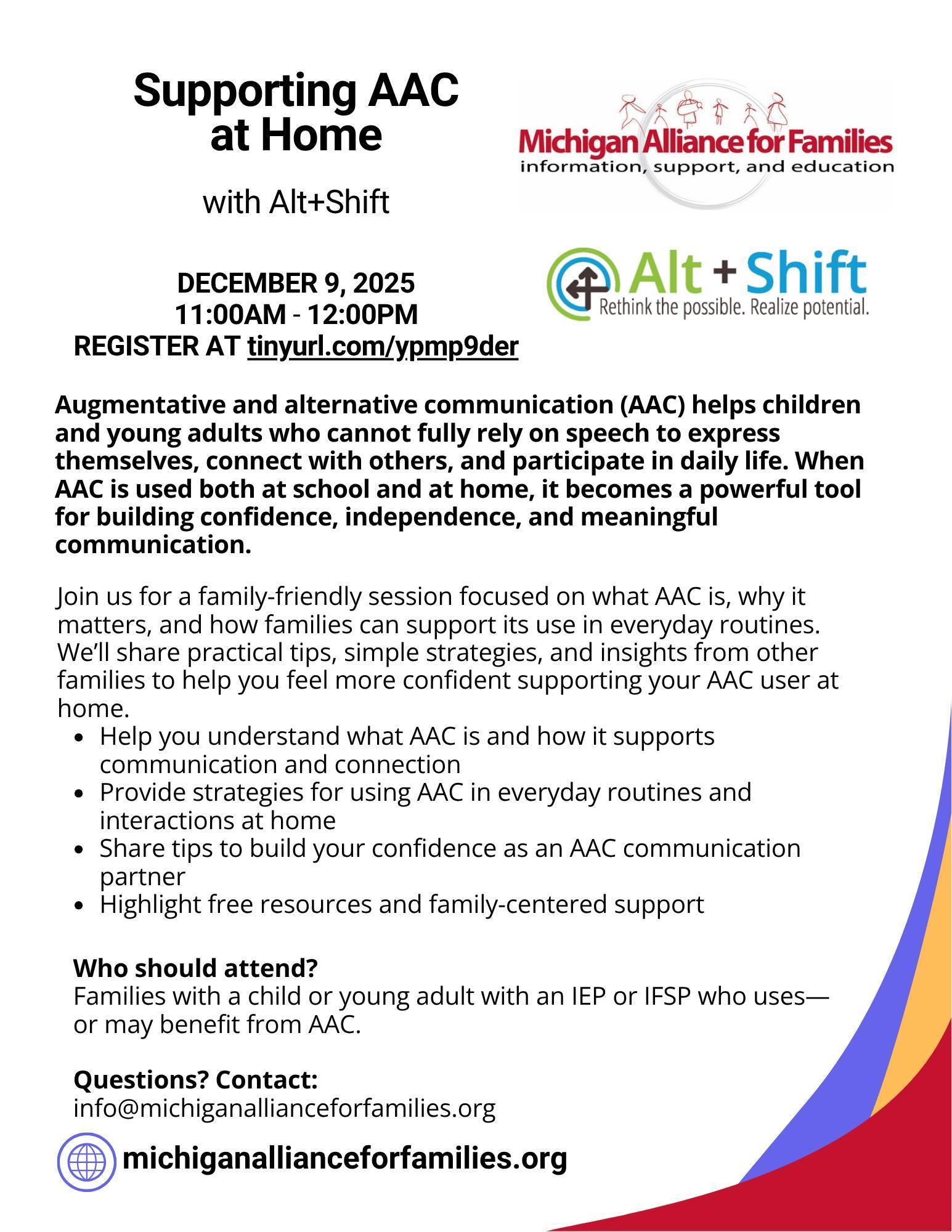 Assistive Technology enables people with disabilities to participate more fully in all aspects of their lives – at home, at school, and in their community. Alt+Shift and Michigan Disability Rights Coalition will be talking technology during three November and December webinars. At the November 12 webinar Assistive Technology: What It Is and Why It Matters, we will explore what AT is, share examples across a range of tools, from no-tech strategies to high-tech devices, and discuss how AT supports learning and participation across all ages and stages. Who should attend? Families with a child or young adult with an IEP or IFSP who uses— or may benefit from AAC. Register now to save your space! FREE.
