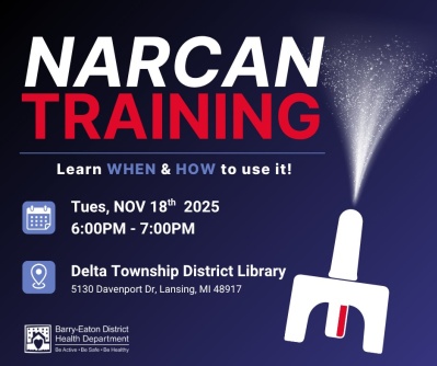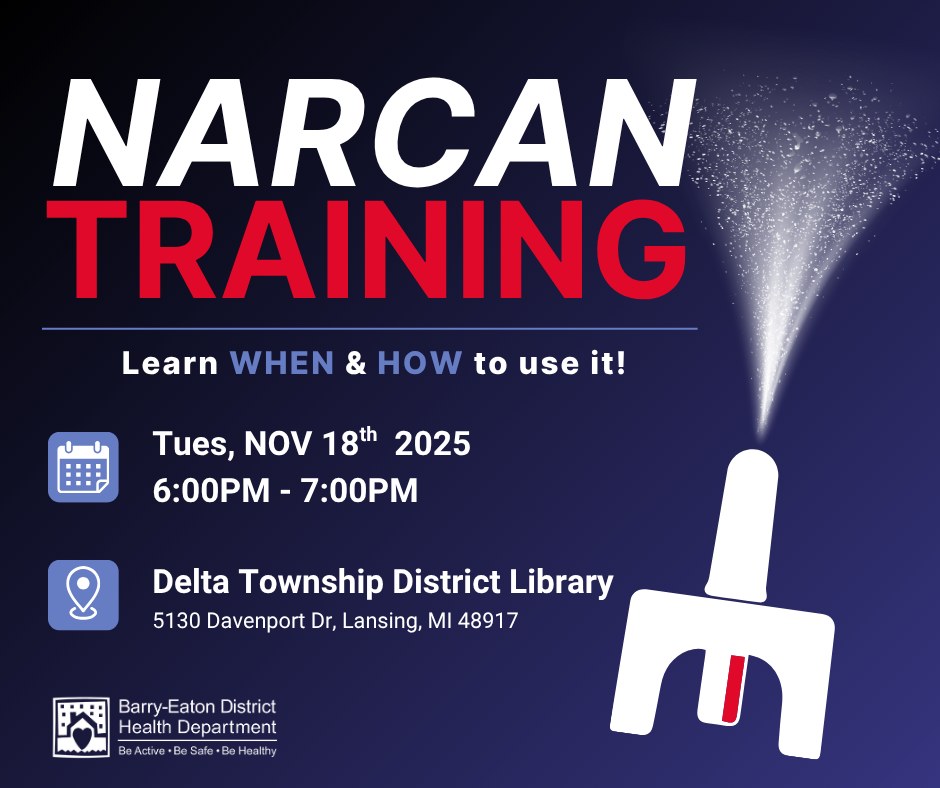 Learn to Save a Life! Join us for a FREE educational session on the opioid epidemic and how to use Narcan, a life-saving nasal spray that can reverse an opioid overdose. You’ll learn how to recognize the signs of an overdose, take part in a hands-on demonstration, and receive a free Narcan kit to take home. Need accommodations? Please fill out this form: https://bit.ly/3qvMgTZ or contact Rebekah Condon at (517) 541-2694. Presented by the Barry-Eaton Health Department. FREE.