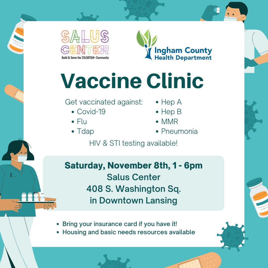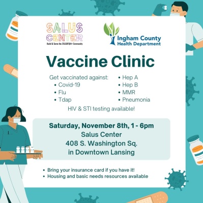 Get vaccinated against COVID-19, flu, Tdap, Hep A, Hep B, MMR, pneumonia. HIV & STI testing also available. Bring your insurance card if you have it. Housing and basic needs resources available. Provided by the Ingham County Health Department.