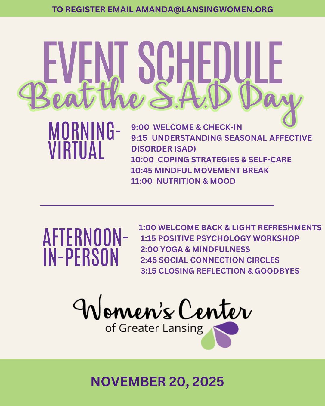 Afternoon: In-Person at the Women’s Center of Greater Lansing Enjoy a day of mindfulness, movement, connection, and self-care, all designed to help you thrive through the season. Register today: amanda@lansingwomen.org. FREE.