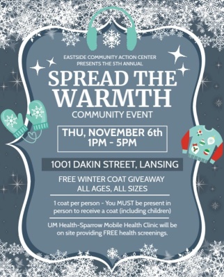 Eastside Community Action Center presents the 5th Annual Spread the Warmth Community Event, with a FREE WINTER COAT GIVEAWAY. All ages, all sizes, 1 coat per person (you must be present). UM Health-Sparrow Mobile Health Clinic will be onsite providing FREE health screenings. FREE.