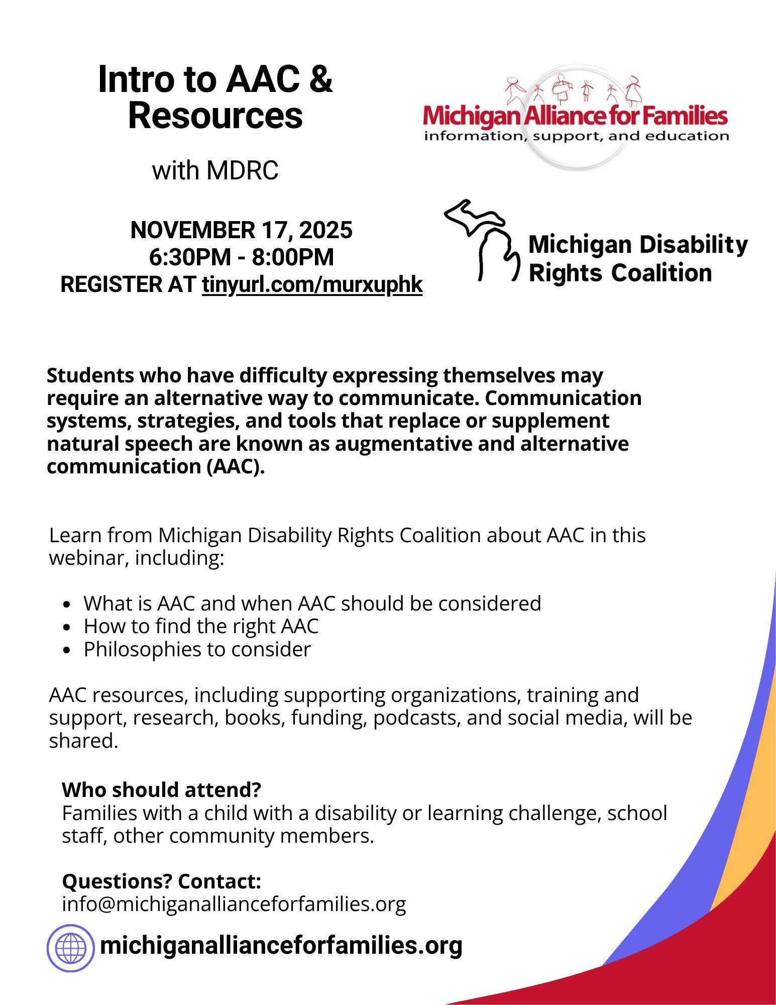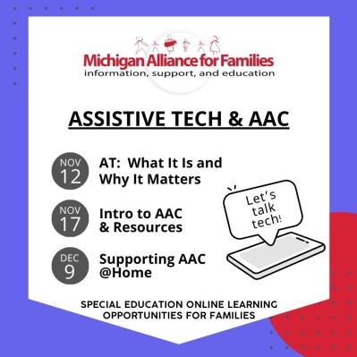 Students who have difficulty expressing themselves may require an alternative way to communicate. Communication systems, strategies, and tools that replace or supplement natural speech are known as augmentative and alternative communication (AAC). At the November 17 webinar Intro to AAC & Resources with Michigan Disability Rights Coalition, we will explore what is AAC and when AAC should be considered, how to find the right AAC, and philosophies to consider. Who should attend? Families with a child with a disability or learning challenge, school staff, other community members. Register now to save your space! FREE.