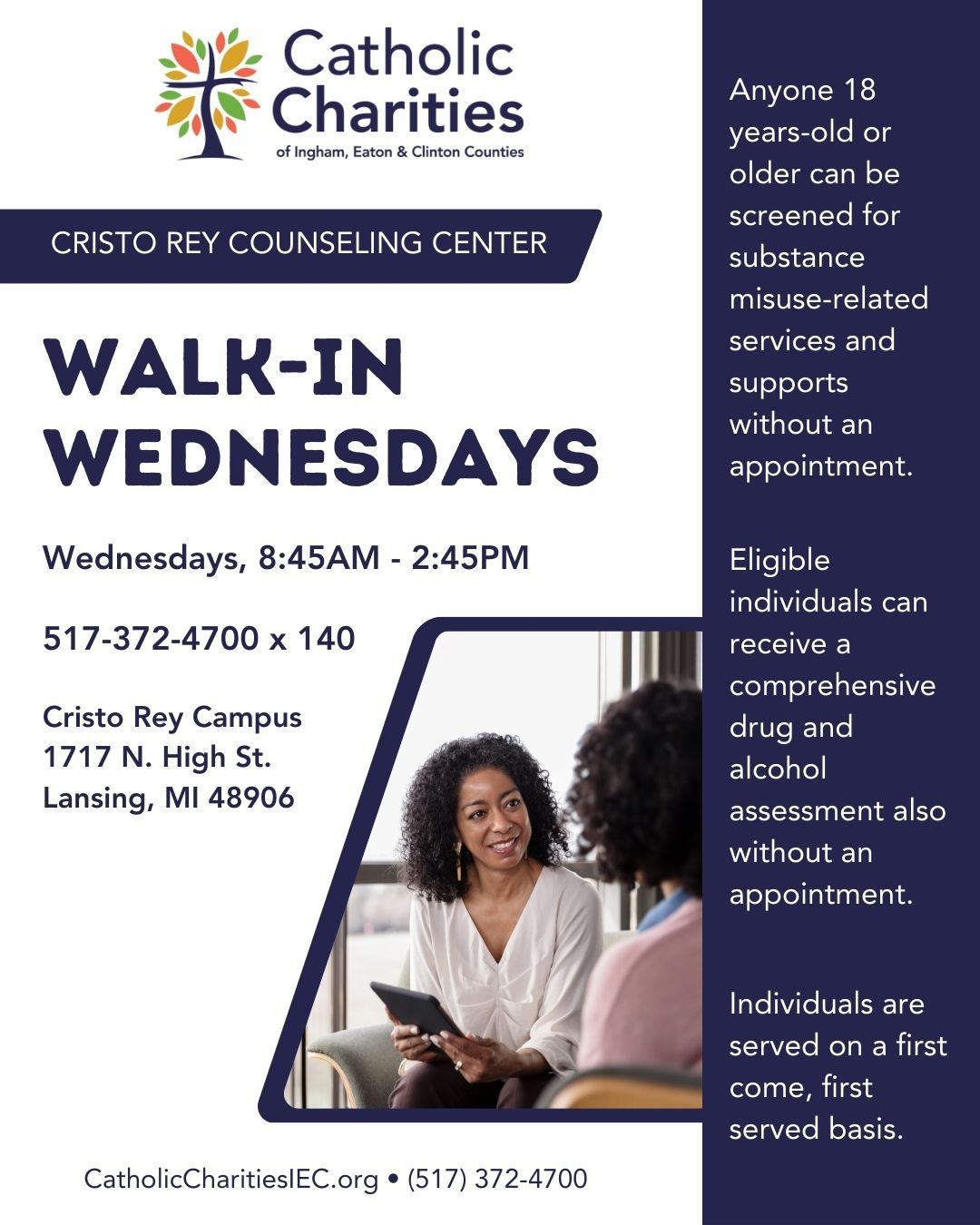 Walk-In Wednesdays: Walk-In Wednesdays at Cristo Rey Counseling Center are every Wednesday, 8:45AM - 2:45PM. Anyone 18 years old or older can be screened for substance misuse-related services and supports without an appointment. Eligible individuals can receive a comprehensive drug and alcohol assessment also without an appointment. Individuals are served on a first come, first served basis. For more information, visit https://catholiccharitiesiec.org/ or call 517-372-4700 ext 140.